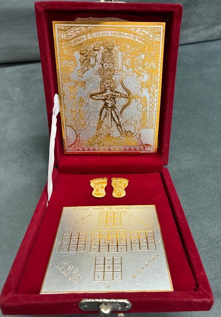 Ghantakaran Mahavir - Vyapar Vruddhi Yantra & Charan Kamal on white metal, Engraved & Silver Gold  finishing,  fitted in Velvate Box, available ready stock